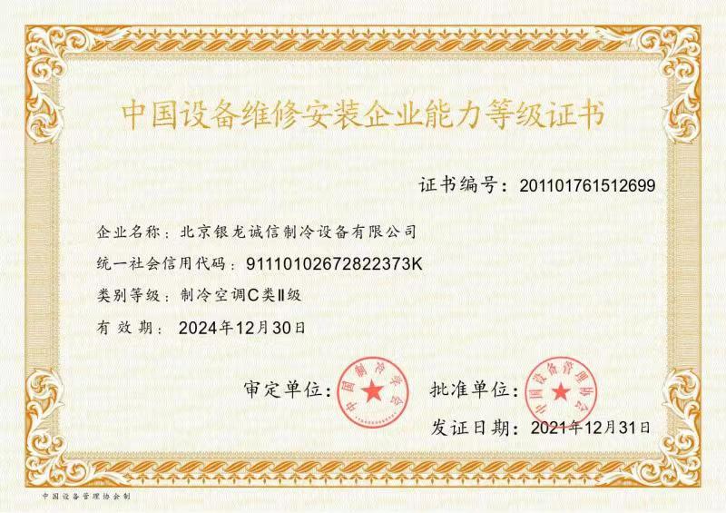 2007年:獲準(zhǔn)成為北京市制冷行業(yè)技術(shù)學(xué)會理事單位; 2009年:獲得北京市大興區(qū)百強企業(yè)認(rèn)證; 2009年:獲得國家高新技術(shù)企業(yè)認(rèn)證; 2011年:獲北京市安全生產(chǎn)先進企業(yè)稱號,節(jié)能環(huán)保先進單位; 2012年:通過了國家高新技術(shù)企業(yè)復(fù)審; 2013年:公司董事長獲"2013北京先進企業(yè)家"榮譽稱號; 2014年:獲2014年度中國冷庫工程安裝設(shè)計造價行業(yè)十大品牌;